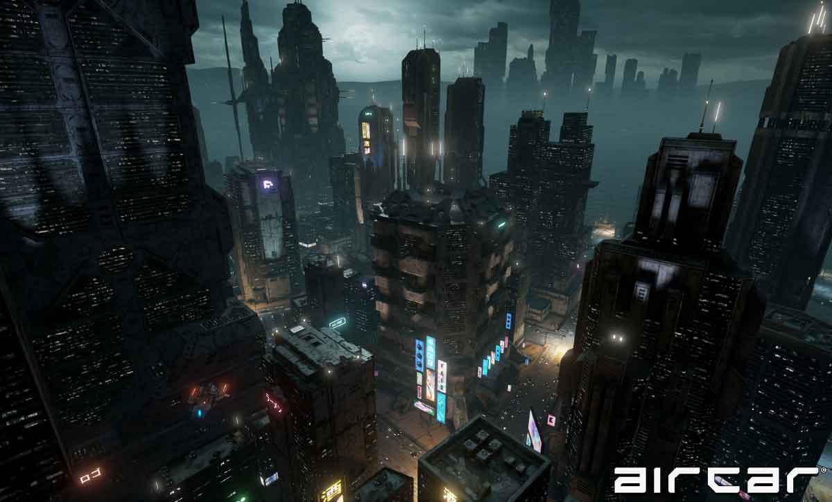 Wie es wohl ist, in einem fliegenden Auto unter einem rußfarbenen, regnerischen Himmel und an bunten Leuchtreklamen vorbei durch das glitzernde Lichtermeer einer futuristischen Megacity zu fliegen? Aircar gelingt es, genau dieses Erlebnis einzufangen.
