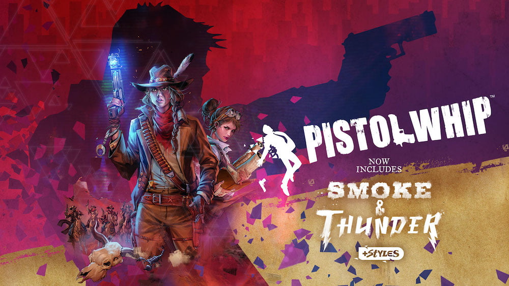Cloudhead Games bringt am 12. August 2021 eine zweite Mini-Kampagne heraus, dieses Mal mit Western-Szenario. Smoke & Thunder bietet wie Pistol Whip 2089 fünf neue, besonders dicht gestaltete Szenen, die eine zusammenhängende Geschichte erzählen. Zwischen den Szenen kommen erneut stylische Comic-Panels zum Einsatz, die die Ballersequenzen narrativ rahmen und die Erzählung vorantreiben.
