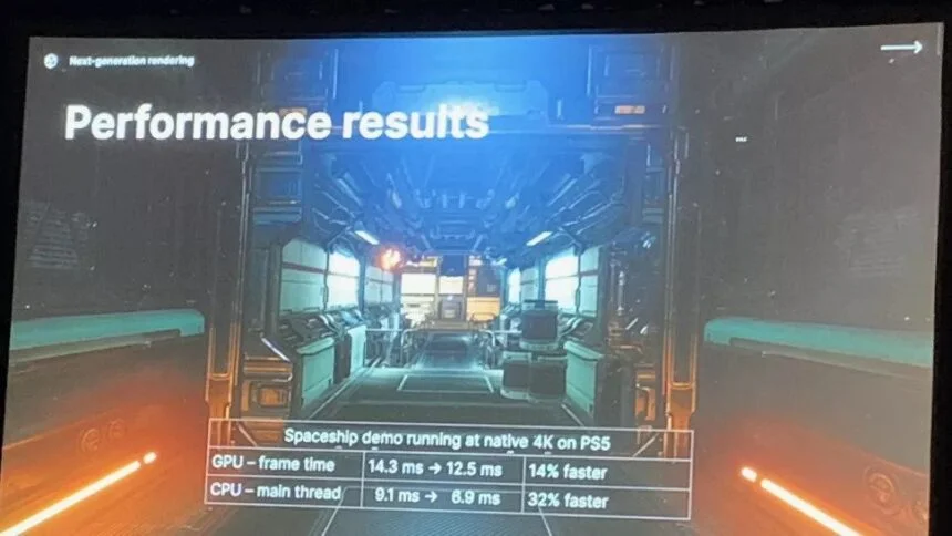 In einer 4K-Raumschiffdemo fällt der Performance-Gewinn weniger deutlich aus. Doch auch hier seien CPU-Thread-Leistung 32 Prozent und GPU-Frame-Time jeweils 14 Prozent schneller.