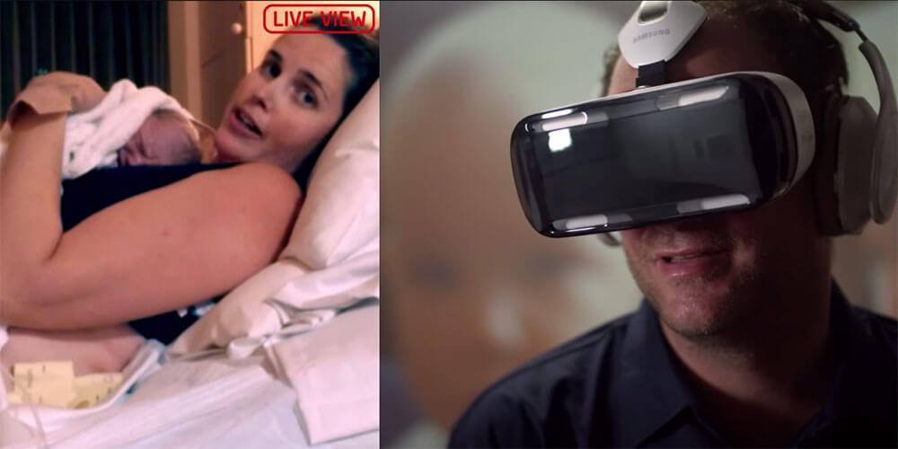 Australien ist ein weites Land - mehr als 4.000 Kilometer ist ein werdender Vater, der beruflich verreist ist, von seiner hochschwangeren Frau getrennt. Bei der Geburt seines Kindes kann er nicht vor Ort sein. Um ihm trotzdem das Gefühl zu geben, im Kreisssaal zu stehen, verfolgt er die Geburt per Live-Stream und Virtual-Reality-Headset (Gear-VR mit Note 4). Samsung nennt das "worlds first live virtual reality birth" und veröffentlicht dazu einen Werbefilm. Mit großem Erfolg: Innerhalb weniger Tage konnte der Clip schon mehr als zehn Millionen Klicks sammeln. Obwohl das Video stark inszeniert ist und nicht deutlich wird, ob das Ereignis tatsächlich in der Form stattgefunden hat, zeigt es ein potenzielles Anwendungsfeld von Virtual Reality abseits von Film und Spiel: VR als immersives Live-Kommunikationsmedium.